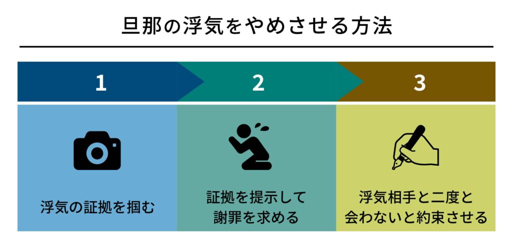 旦那の浮気を放置すると上記のようなリスクがあるので、早めに浮気をやめさせることが大切です。旦那の浮気をやめさせる方法について説明します。