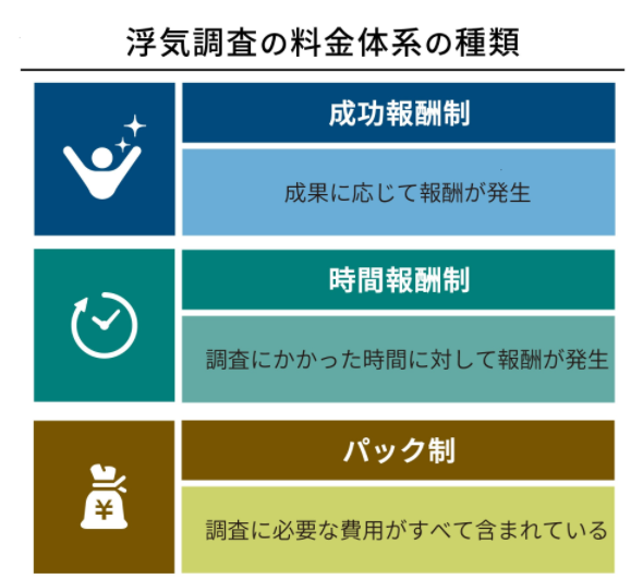 浮気調査の主な料金体系として、成功報酬制、時間報酬制、パック制の3つの種類があります。それぞれの仕組みについて説明します。