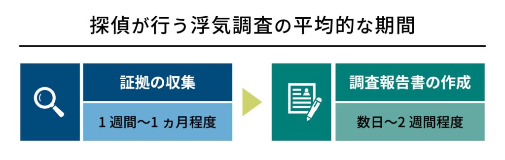 浮気調査の期間は、調査の目的やパートナーの浮気の状況によって変動しますが、平均としては1週間から1か月の間で証拠を収集することが多いでしょう。