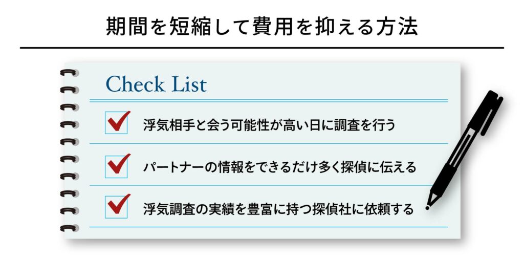 上記の調査結果から、調査期間が短ければ費用の総額を抑えられることが一般的な傾向だといえるでしょう。調査期間を短縮して費用を抑える方法について説明します。