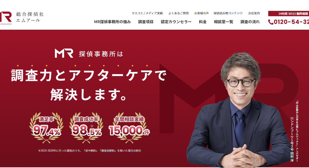 MR(ミッションリサーチ)探偵事務所は、年間相談件数が15,000件を超える大手探偵事務所です。